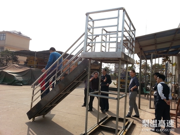 目前研制出的新型绿通现场验货云梯拟安置在出口两个车道之间,方便2条车道日常验货,外型上采用轮轴推动式,停靠简单,攀爬安全。现场工作人员说,相比以前使用的人工楼梯,新型验货云梯更为方便快捷,其顶端采用平台布局,可容纳2-3名收费员、车主同时上台验货,梯高满足大部分货车箱顶层货物查验。