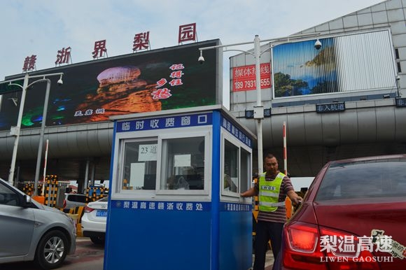 赣浙界梨园站收费广场工作人员用高音喇叭、巨型LED屏幕、电子显示屏、限高龙门架等,从多角度引导不同类型车辆分道行驶。除安排了专人值守ETC车道,启用移动式收费岗亭及便携式收费机外,在收费广场还设置了应急收费窗口。