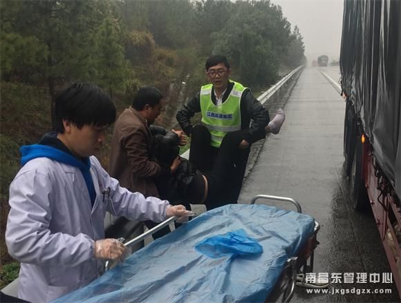 据了解,原来该男子与妻子在货车上因某事发生矛盾,妻子一时气愤从高速行驶的车上跳出,头部受伤严重。十多分钟后,救护车赶到现场,傅学君和蒋诗发协助几名医护人员将女子抬上车紧急送往医院救治。