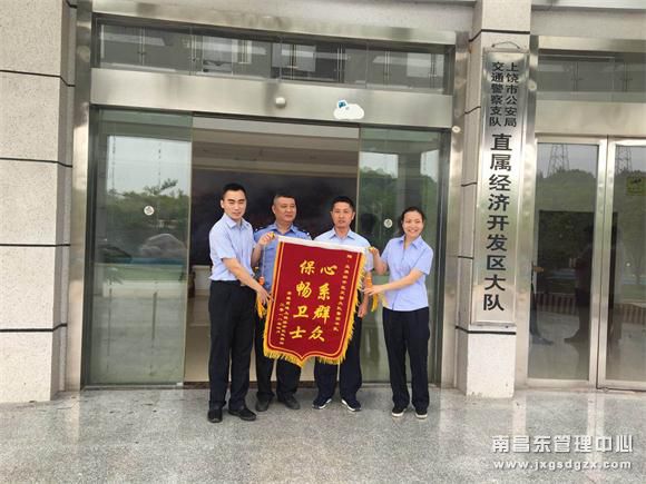 5月3日,南昌南管理中心上饶经开区收费站负责人来到属地交警大队,将一面绣着“心系群众 保畅卫士”八个大字的锦旗赠送给了驻地交警董团中队负责人手中。在经开区交警大队会议室,双方进行了坦诚交流,举行了简短会谈。