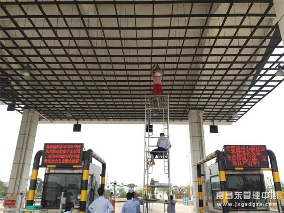 近日,南昌南管理中心樟树东收费站在收费车道搭起脚手架,安装师傅对顶棚灯进行更换成LED投光灯,为喜迎国庆70周年增添氛围。