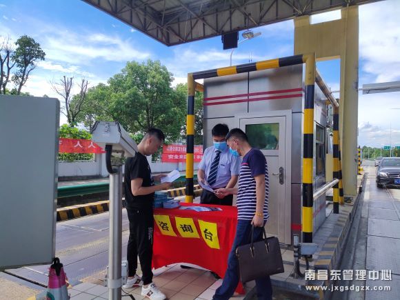 在鹰潭收费站岗亭,该站设立安全生产宣传咨询台,向来往司乘群众发放安全生产手册,普及“安全生产法制、责任制”、“高速公路安全行车必知”、“高速公路应急处理办法”等安全实用知识。同时,与司乘群众互动,邀请司乘群众参与安全知识问答、检查消防器材等活动环节,为司乘群众答疑、解惑安全问题,赠送爱心纸巾等小礼品,开展高效安全的公共开放安全宣传咨询服务。