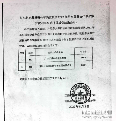 南昌南管理中心东乡养护所杨梅岭车辆救援队2022年吊车服务协作单位第三次询比采购项目成交结果公示