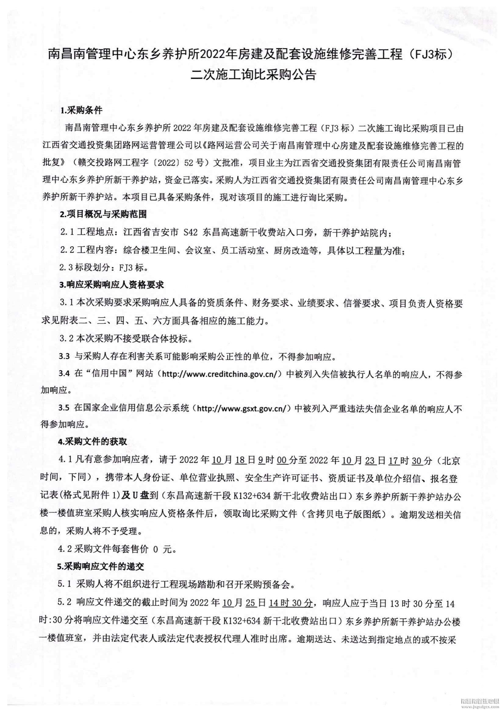 南昌南管理中心东乡养护所2022年房建及配套设施维修完善工程(FJ3标)二次施工询比采购公告及固化清单