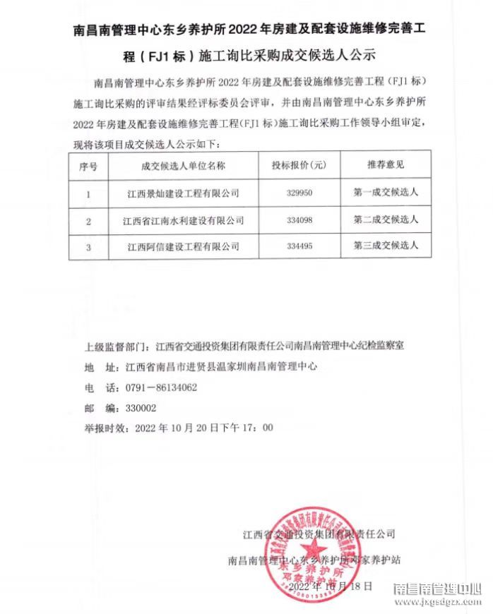 南昌南管理中心东乡养护所2022年房建及配套设施维修完善工程(FJ1标)施工询比采购成交候选人公示