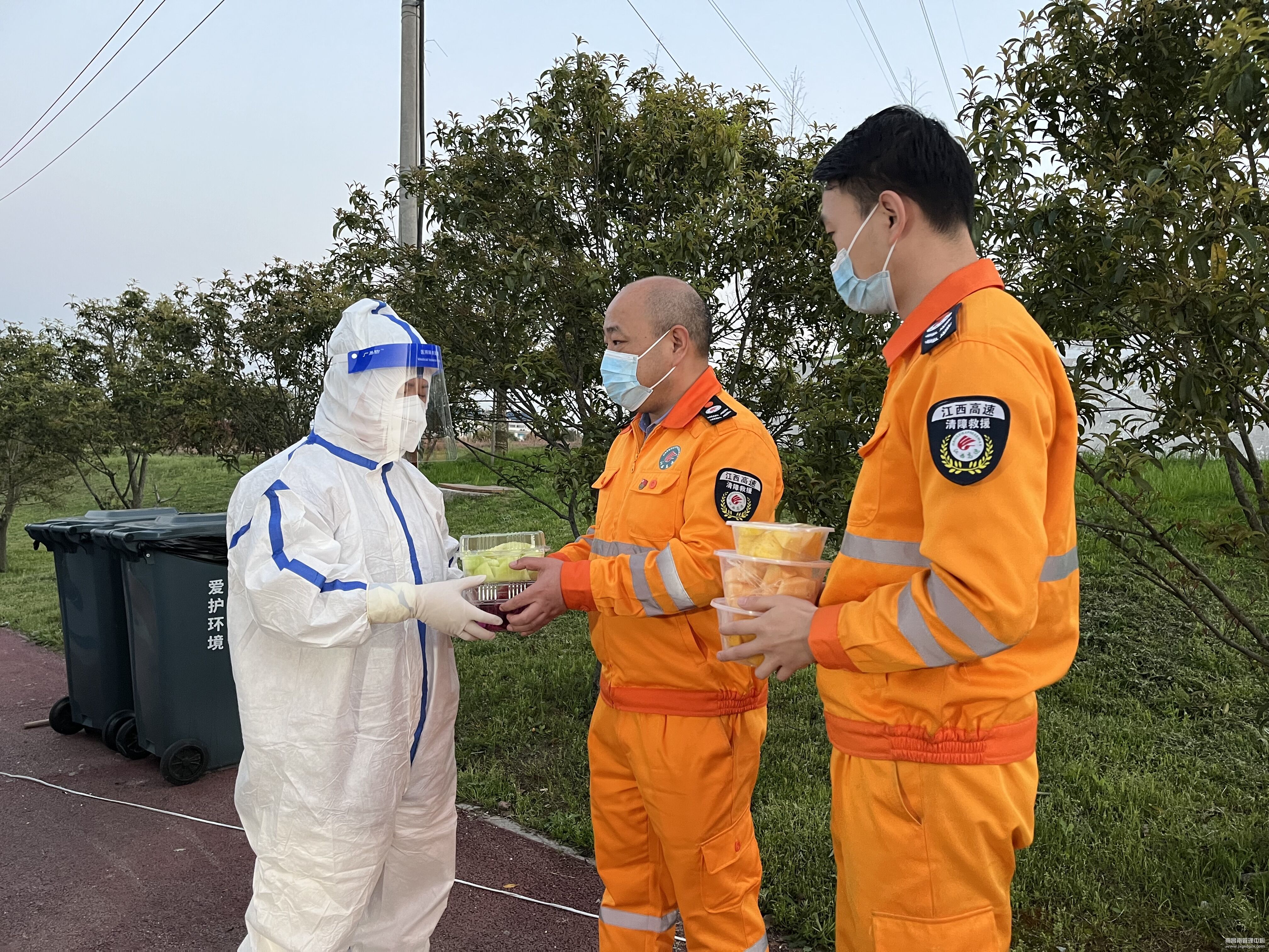 为了向免费提供核酸检测的“大白”们表达谢意,车辆救援大队主动采购了火龙果、哈密瓜、凤梨、芒果等营养丰富的新鲜水果,洗净、切好、分装,第一时间将其送到杨梅岭收费站出口处正在做核酸检测的医护人员的手上,感谢他们坚守岗位,为人民的安全把好关口。