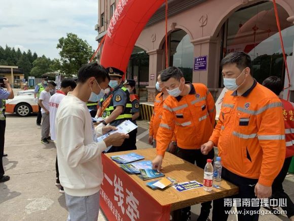 6月15日,南昌南管理中心邓家养护站联合高速交警五支队一大队、交通运输综合执法局五支队一大队在东乡服务区开展了现场消防安全演练及普法安全知识宣传活动。