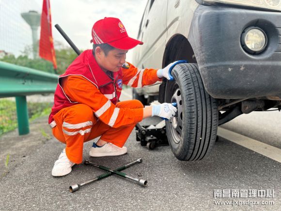 该大队增设了3组由党员组建的巡逻小组,每天早中晚根据车流量前往路面巡查,如果遇到故障车辆,立即上前询问情况,为司乘人员提供了免费的搭电、更换备胎等暖心服务。当天下午16点30分,巡逻小组成员巡逻返回的路上,行至杨梅岭匝道上高速口处,发现路边停靠了一辆小面包车,他们立即上前询问,原来是轮胎发生了漏气,车主吴师傅正准备打电话联系维修人员。随后,巡逻小组成员马上从后备箱拿出了千斤顶和十字套筒,几分钟后便成功为吴师傅免费更换了备用轮胎,吴师傅也立马启程踏上旅途。