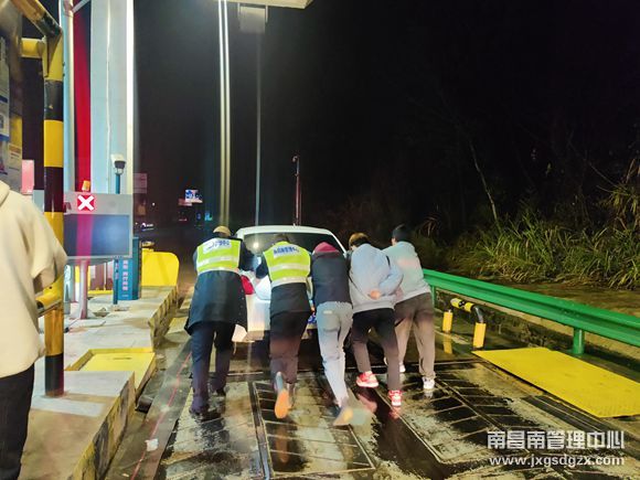 2月6日傍晚,南昌南管理中心余江站口车流量增加,然而一辆小车在出口抛锚无法启动,工作人员发现情况后组织人员展开救援。