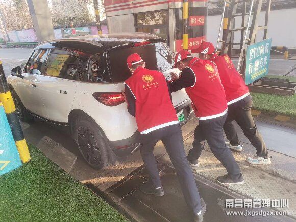 1月1日,新年第一天,在南昌南管理中心东乡收费站收费广场,“红马甲”工作人员热心帮助抛锚的司乘推车化解困难,不仅给节日添上喜庆色彩,也温暖了过往司乘人员。