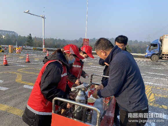 1月10日早上7点,杜市收费站入口因大雾封道,导致大量车辆滞留在收费广场。考虑到收费广场滞留车辆多、预计耗时长,该站积极行动,迅速组织”高速映山红“志愿者服务队,在现场设置便民服务台,志愿者们来回穿梭在车辆之间,热情的将一桶桶热乎的泡面、热开水送到司机的手中,现场还准备了手机充电、修车工具等便民服务,同时为滞留司乘耐心做好解释工作,实时告知道路通行状况,贴心安抚司乘的急躁情绪。