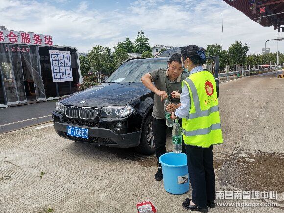 当班班员见状立即赶忙上前询问,得知该车水管可能出现故障,导致车辆高温,不具备安全行驶条件,不能正常行驶。为防止发生拥堵,保证车道与人员安全,该班班员协助乘客及时将小车推至安全区域,并对后方车辆进行疏导。