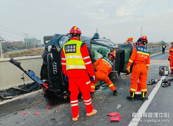 12月26日下午16时15分左右,沪昆高速南昌方向K579公桩处,一辆小车因操作不当发生侧翻,副驾驶有人员被困车内,南昌南车辆救援大队鹰潭中队立即快速出击,与消防人员配合将车上人员解救出来,并快速恢复路面安全畅通。