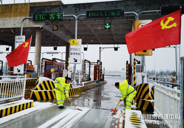 1月22日,雪花飞舞,江西大地被皑皑白雪覆盖,给出行带来困扰。南昌南管理中心乐安北收费站干部职工迅速行动,党员职工战严寒、冒风雪,保畅通。